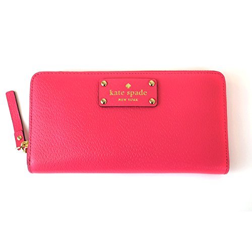 Kate Spade New York Wellesley Neda Rosegold Leather Wallet Clutch WLRU1153 Wrapped in Rosegold textured leather with gold tone hardware. This Kate Spade zip around wallet is accented with the Kate Spade name plate on the front and features a full length slip pocket on the back. Top stitch detailing throughout. The interior is tan leather with coordinating cream and tan fabric. It features a center zippered compartment, 12 card slots and multiple full length bill compartments. Overall measurements of approximately 7.75" (L) x 4.25" (H) x 1" (W).Feature
