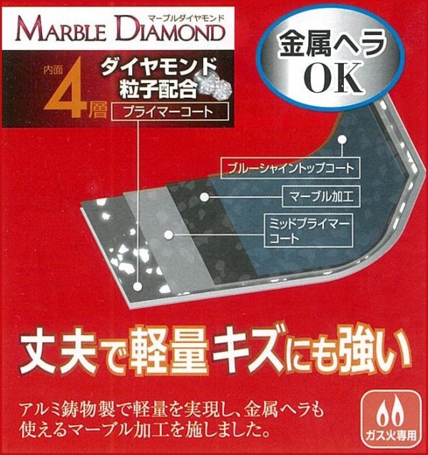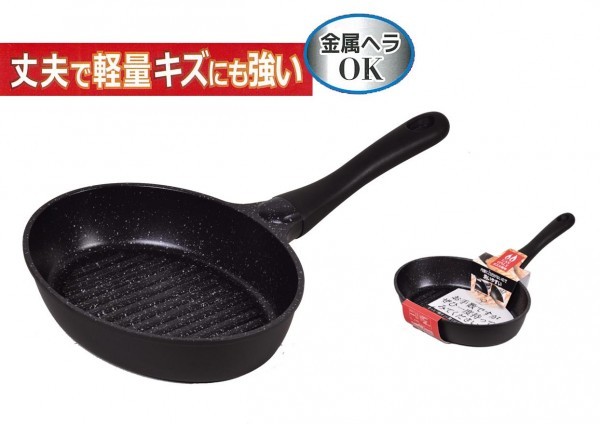 アルミ鋳物製で軽量を実現し、金属ヘラも使えるマーブル加工を施したグリルパンです。
