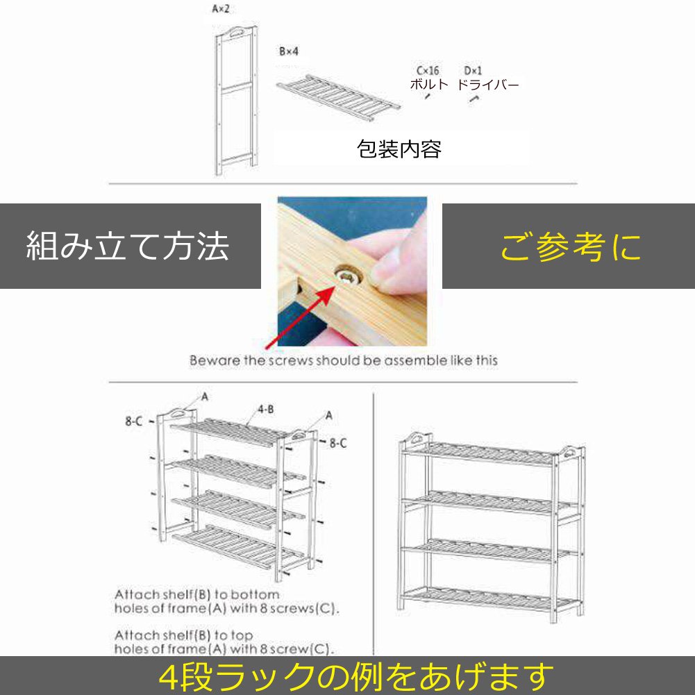 Materials are also better and stronger than I thought, it was okay to put on heavy boots and sneakers! Although it is a four-level structure, I think that it is possible to store long boots, free to assemble with 2 steps, 3 steps. Even myself who is not good at DIY can do it in 15 minutes, so I think that it can be easily assembled regardless of age and sex. Because the material is bamboo and the wood grain is also beautiful, I think that it can be used as a shelf to put plants and accessories in the room, (^ ^)