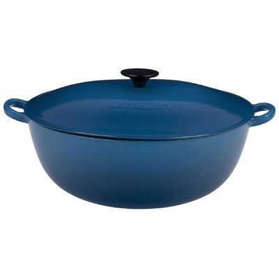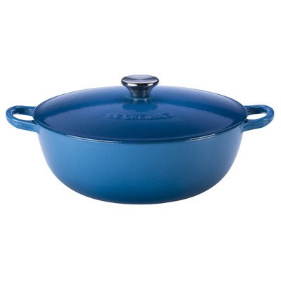 Studio : Le Creuset of America Publisher : Le Creuset of America Binding : Kitchen Product Description Beautiful enough to bring to the table and durable enough to outlive its 101-year warranty against defects, this big pot is perfect for preparing and ceremoniously serving a bouillabaisse, soup, stew, or casserole. Made of cast iron, with an exterior and interior clad in Le Creuset's famous bright enamel, the pot holds 7-1/4-quart and measures 12-1/2-Inch at the top. Because the sides slope to a bottom of only 6-3/4-Inch, the pot fits household stovetop burners. As cast iron is unexcelled for heat distribution and retention, the pot cooks foods evenly and gently without hot spots. The knob on its heavy, tight-fitting lid is ovenproof to 450-degrees F so the pot can go into the oven for casserole cooking. Loop handles facilitate carrying, and the pot is dishwasher-safe 0
