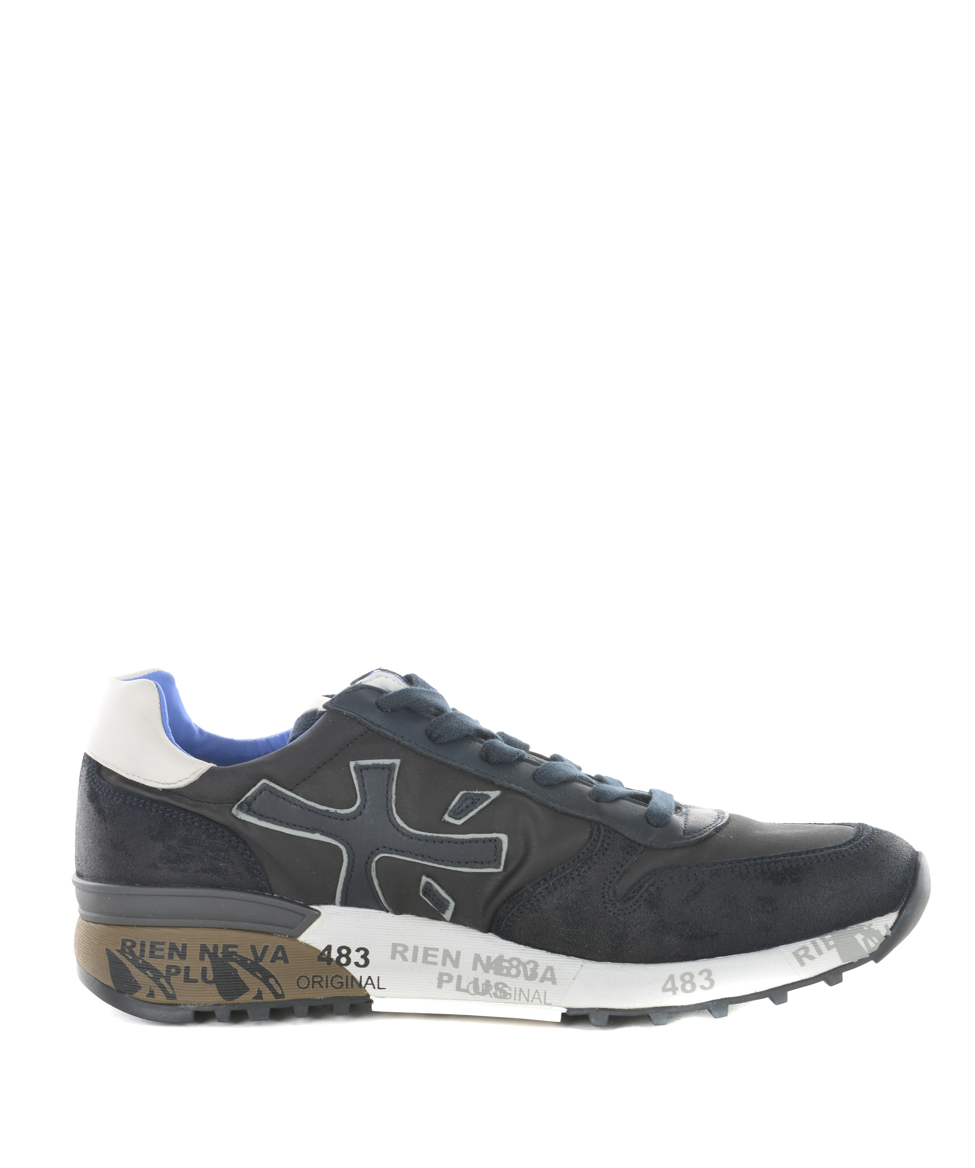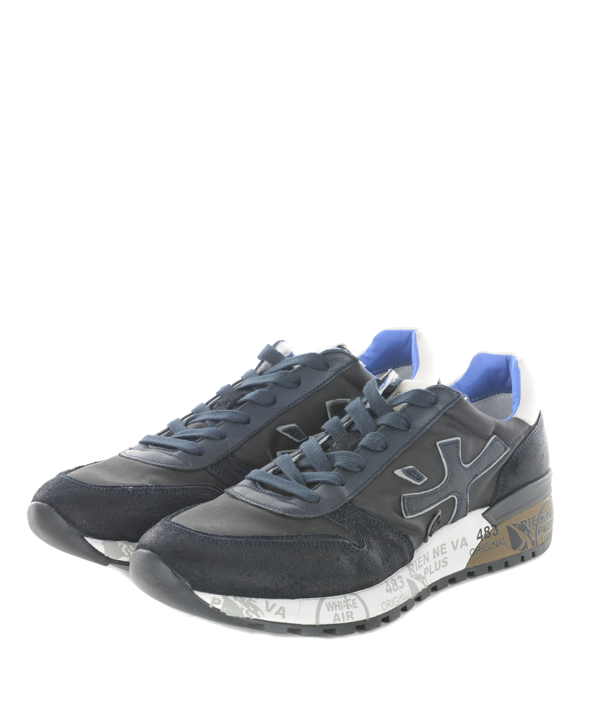Sneakers Premiata in camoscio e nylon Blu scuro. Effetto stone wash. Inserti in pelle. Maxi logo laterale in pelle. Stringate. Etichetta logo sulla linguetta. Suola in gomma stampata. Misura in foto 40