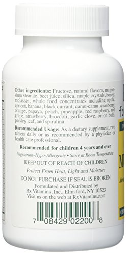 Rx Vitamins' Children's Multi-Vitamins provides a bounty of essential vitamins and minerals to meet the specific nutritional needs of children. Each delicious natural grape flavored chewable tablet supplies 12 vitamins and 9 minerals along with extracts of nature's most healthful whole foods including spirulina, carrot, pineapple, garlic and broccoli. This vegetarian and hypo-allergenic formula is the perfect choice for parents who want superior nutrition for their children. Suggested Use: As a dietary supplement, two tablets daily or as recommended by a physician or health care practitioner. Recommended for children aged 4 and over.Feature