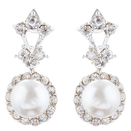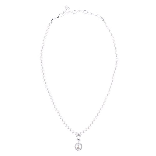- Feature : Color: Silver, Clear, White / Material: Crystal Rhinestones, Faux Pearls, Metal Casting, Rhodium Plated / Dimensions (Size): Necklace: Approx. 14.25" L + 3" extender, Pendant: 1" Drop (Lobster Claw Closure); Earrings: Approx. 0.85" Drop x 0.4" W (Post Back Closures) / Style: Bridal, Wedding, Prom, Fashion / Quantity: 1 Set includes 1 necklace and matching earrings / Lead Compliant