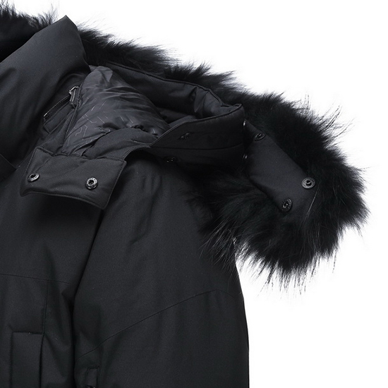 - 탈착이 용이한 후드 디테일과 너구리 FUR 장식을 보여줌.