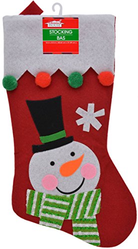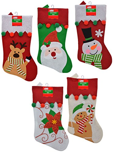 - Bundle of 5 Felt Christmas Character Stockings with Pom-Pom Embellishments. 1 of each - Gingerbread Boy, Santa, Snowman, Reindeer, Poinsettia