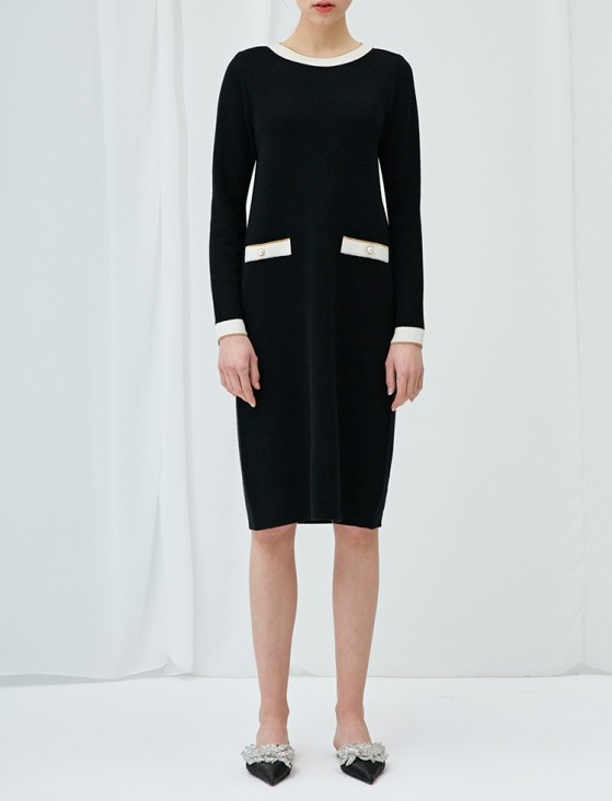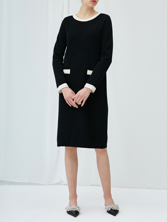 울, 캐시미어 혼방 소재로 제작한 여유있는 핏의 니트 원피스입니다.블랙&화이트의 컬러배색이 단정하고 클래식한 무드를 연출 해 주며, 골드컬러의 배색 라인 디테일로 포인트를 더하였습니다.프론트에는 페이크 포켓과 진주 장식이 있어 밋밋해보이지 않고 여성스러운 느낌을 줍니다.베이직한 디자인으로, 단품 또는 아우터의 이너로도 활용하기 좋은 아이템입니다.