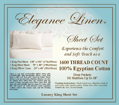 -. Brand : Elegance Linen -. Feature : 1 Flat Sheet (92" x 102") 1 Fitted Sheet (60" x 80") and 2 Standard Pillow Cases (20" x 30") / Fits mattresses up to 14" - 16" deep with elastic all around the fitted sheet / Micro fiber sheets are as soft as 1,600 thread count Egyptian cotton / Easy care sheets are machine washable and require no ironing / Elegance Linen ® - High Quality and has a breathable weave -. Label : Elegance Linen -. Manufacturer : Elegance Linen -. ProductGroup : Home -. ProductTypeName : HOME_BED_AND_BATH -. Publisher : Elegance Linen -. Studio : Elegance Linen -. Title : Elegance Linen ® 1600 Series Luxury Silky Soft 4 pcs Sheet set, Deep Pocket Up to 16" -Wrinkle Resistant - ALL SIZES AND COLORS AVAILABLE