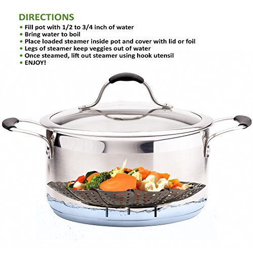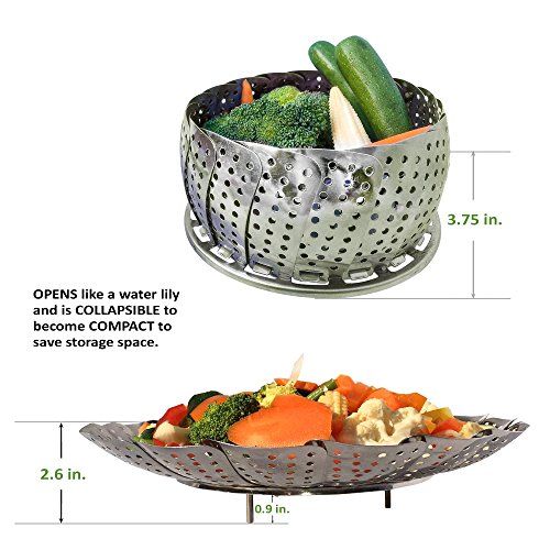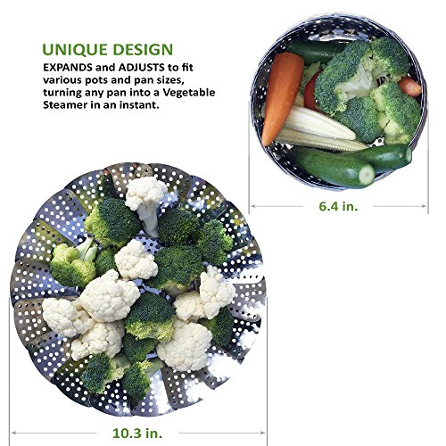 UNIQUE DESIGN & DISHWASHER SAFE - (Diameter - 6.4 inches to 10.3 inches, Leg Height - 0.9 inch) EXPANDS and ADJUSTS to fit various stock pots and pan sizes contrary to silicone steamers & baskets, turning any pan into a Veg Steamer Utensil in an instant. OPENS like a water lily and is COLLAPSIBLE to become COMPACT to save storage space unlike bulky Chinese bamboo rack and electric microwave processors. PRESSURE POWER COOKER friendly and AROMA, FAGOR, KITCHENAID Attachment Accessories.