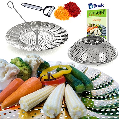 Vegetable Steamer Basket Large Complete Bundle by Kitchen Deluxe - 100% Premium Stainless Steel - Bonus 2 in 1 Ultra Sharp Julienne Veggie Peeler, Hook Utensil and Food Recipe eBook - 6.4" to 10.3"