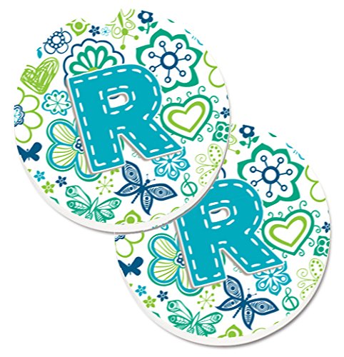 Caroline's Treasures Letter R Flowers & Butterflies Teal Blue Set of 2 Cup Holder Car Coasters CJ2006-RCARC, 2.56, Multicolor