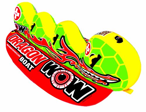 The banana boat style tube was invented in 1984 and became one of the most popular towables of all time. Millions were sold but nothing new has ever been done to improve their performance until now. WOW introduces a new improved version that gives each rider their own cockpit with backrest to separate each rider and hold them on the tube. We have also doubled the width of the side pontoons. All of these features improve the stability and safety of this style of tube. The wider side pontoons also make this item very easy to get on while in the water. We have created a great new look with the Dragon Boat which is a lot more fun than the original torpedo. The Dragon Boat is the perfect tube for a fun, safe ride for people of all ages. A great tube for the family.Feature