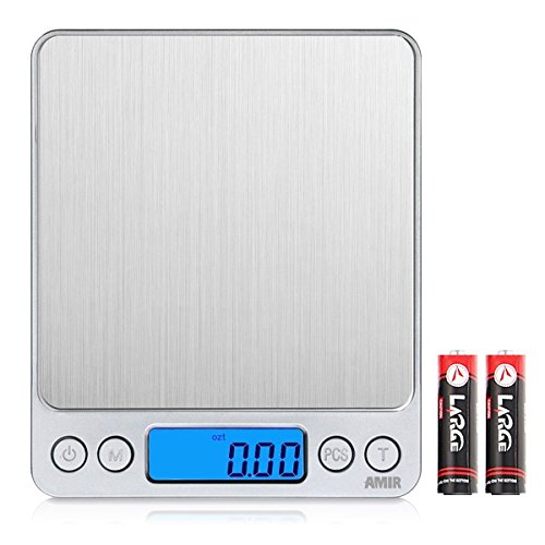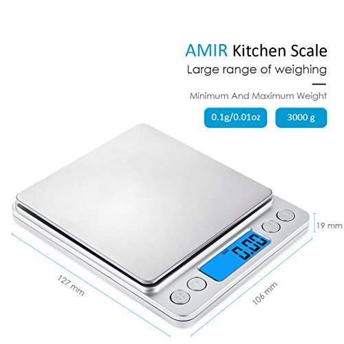 - Large Weighing Range & Refined Accuracy: AMIR digital kitchen scale manufactured with advanced high precision sensors to provide you refined accuracy up to a large weight range of 3000g, 0.01oz/ 0.1g. Easy to clean and use, make it an ideal to measure jewelry, medicine, and cooking ingredients with high precision.