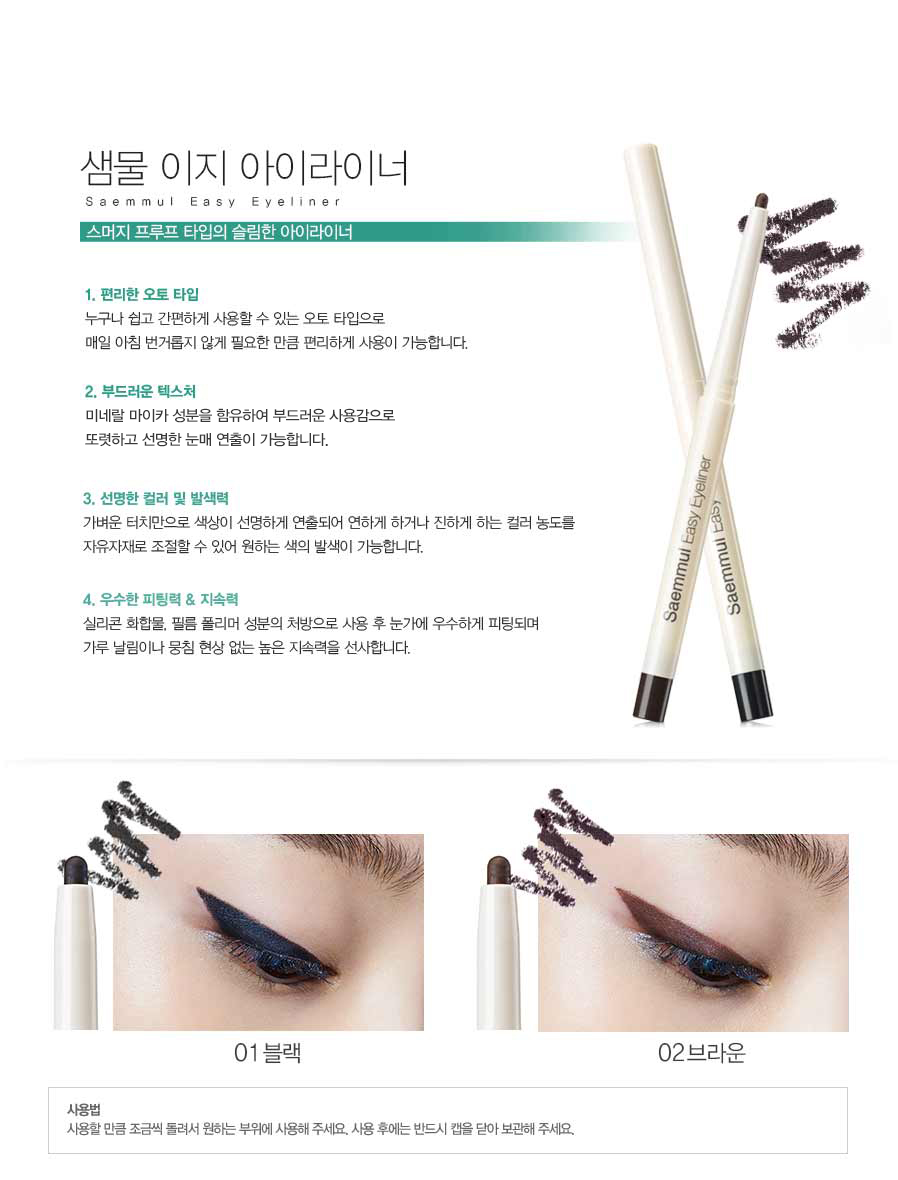 Convenient auto type. The mineral mica ingredient smoothly expresses vivid and clear eyes. Even the light touches are enough to express vivid color, allowing the freedom of color concentration. Silicon compound and film polymer ingredients fit to the eyes without any particles or cluttering with superb tenacity.