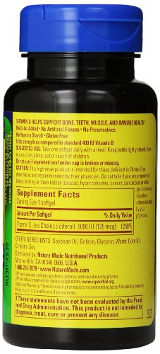 -. Binding : Health and Beauty -. Brand : Nature Made -. Color : multicolored -. EAN : 0031604027780 -. Feature : Vitamin D supports teeth, bone and immune health / Ensuring healthy levels of vitamin D in your body helps support heart health / No artificial colors, flavors or preservatives -. IsAdultProduct : 0 -. Label : Nature Made -. Manufacturer : Nature Made -. MPN : 2778 -. NumberOfItems : 1 -. PackageQuantity : 1 -. PartNumber : 2778 -. ProductGroup : Health and Beauty -. ProductTypeName : HEALTH_PERSONAL_CARE -. PublicationDate : 2012-07-27 -. Publisher : Nature Made -. Size : 180 -. Studio : Nature Made -. Title : Nature Made Vitamin D3 5000 IU,180 Softgels -. UPC : 031604027780