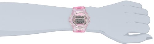 Pink casual watch with digital display featuring shock resistance, EL backlight with after-glow, world time, daily alarm, countdown timer, stopwatch, and 12/24-hour formats