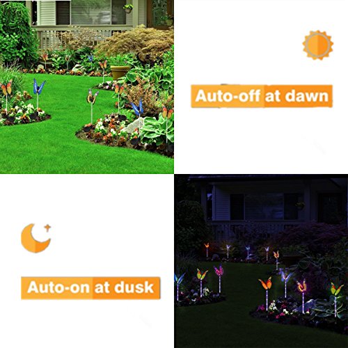 - ★Environmentally and Automatically: butterfly lights are powered by solar energy, full charged by being exposed to sunlight for 6-8 hours, and work for 8-12 hours. The improved garden butterfly solar lamp lights up automatically with light sensitive lamp in the dark to illuminate your garden and pathway, and light off during the day. You can also turn it off with the switch which in back of solar panel.