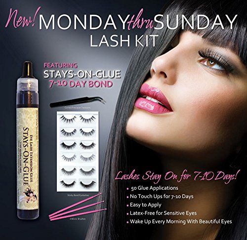 The Monday Thru Sunday Lash Kit is like no other. Each eyelash lasts up to 7 days with the new Stays On Glue Formula. This patented formula allows Strip Lashes to stay on for up to 7 full days. Hypoallergenic, waterproof, and latex free allows for outstanding stay wear of flexi-band lashes. Flexi-Band lashes are made by Lashes and Glue allowing lashes to bend and flex contouring and matching the eye-shape for comfortable wear making them feel like you are wearing nothing at all. 3 Micro Brushes are included to brush on glue to back of lashes before and after application. Do a touch up of Lash Glue anytime for extra strong glue. Just brush over the lashes. 3 Easy Step Instructions laminated card included.Feature