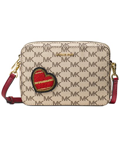 -. Feature : MK Signature Coated Twill faux leather; lining: polyester / Zip closure. Gold-tone exterior hardware, logo & heart detail. / 1 interior slip pocket & 3 card slots. / 21-1/2"-25"L adjustable strap / Medium sized bag; 7-1/2"W x 5-1/4"H x 1-3/4"D