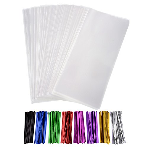 Outus 300 Pack Clear Treat Bags Clear Cello Bags with 320 Pieces Twist Ties 8 Colors for Wedding Cookie Christmas Gift Candy Buffet Supply Valentine Chocolates(4 x 9 Inches)