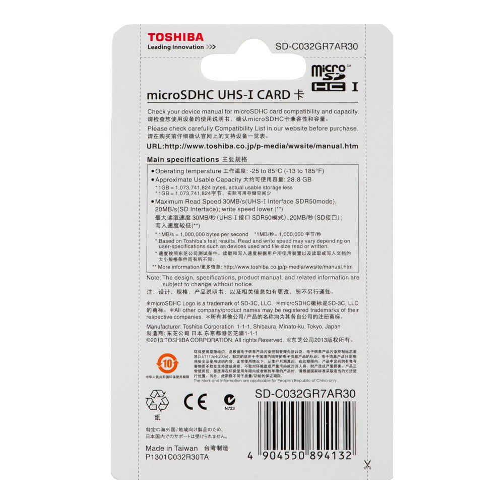 Toshiba 32GB microSD HC Memory Card Class 10 (Read 95MB/s Write 60MB/s)