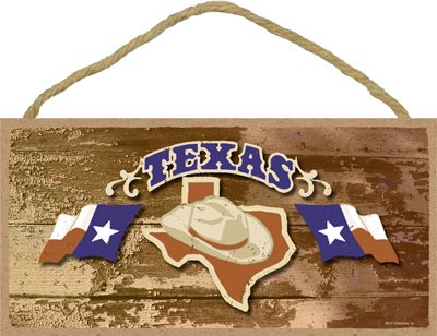 (SJT13469) Texas - State Outline With Cowboy Hat And Flags - Distressed Wood Background 5" x 10" Wood Plaque Sign