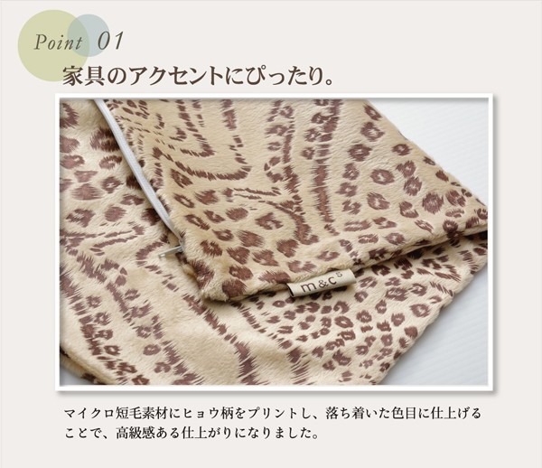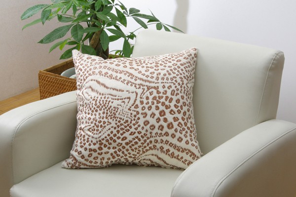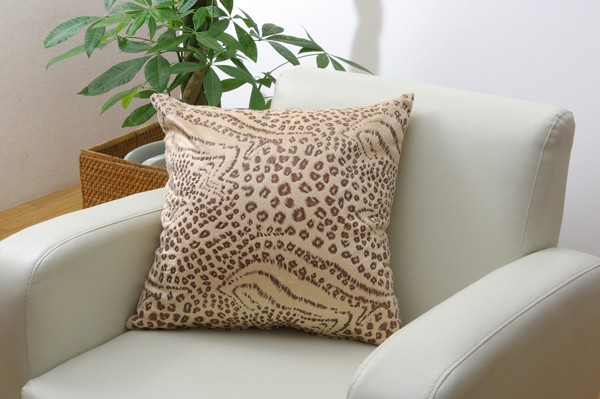 落ち着いた色目のベーシックなレオパード(ヒョウ)柄クッションカバーです。側地には手触りが気持ちよいマイクロファイバーの短毛生地にレオパード柄をプリントしました。カラーもベージュとナチュラルでソファーに合わせやすい、高級感のある色目に仕上げました。ちょっとしたアクセントクッションとしてお部屋のイメージアップにお使い下さい。本商品はファスナータイプですので付け外しが簡単です。ご家庭の洗濯機で丸洗い可能なので清潔にご使用頂けます。