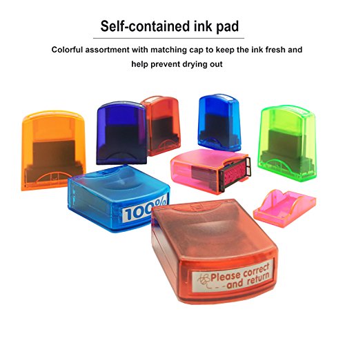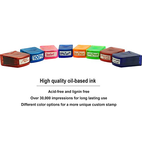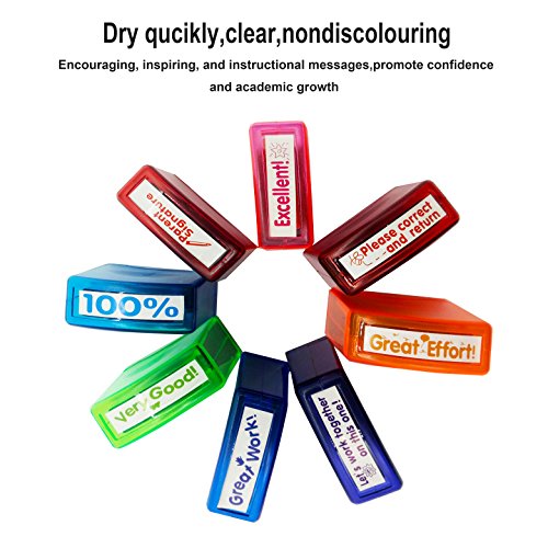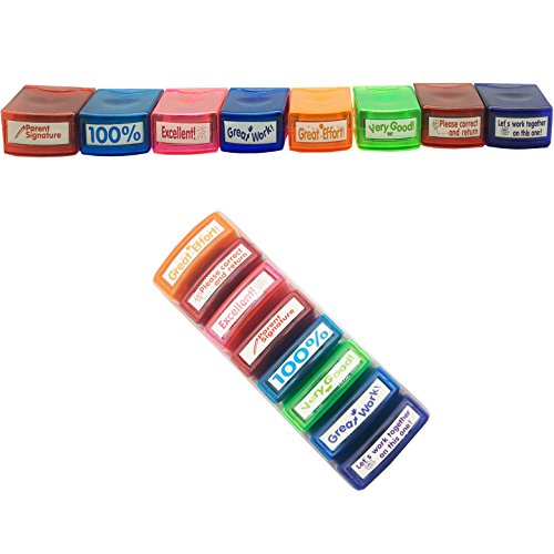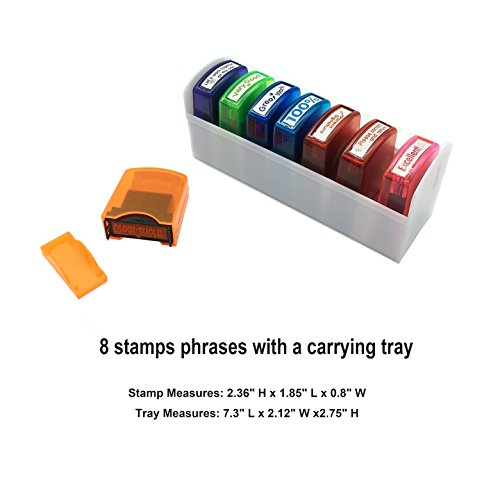 Each set contains 8 different styles of stamps w/convenient plastic storage tray. Self inking, no need for a separate ink pad. Each Stamp Makes Over 30,000 Impressions Acid Lignin Free Features Fun Cartoon Designs Motivating Messages Assorted colors create a fun and visual display that really transforms learning and assessing your students work into a fun experience for both the student and the teacher Perfect for elementary schools and even preschools,home or the classroom Promotes Academic Growth Tray Dimensions: 2.36" Hx1.85" Lx 0.8"W Stamp Dimensions: 7.3" Lx2.75" Hx2.12"W 0