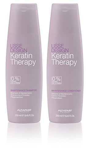 Alfaparf laisse design keratin therapy maintenance shampoo and conditioner duo 8.45oz. each Paraben, sulphate and salt-free shampoo Gently cleanses the hair and helps maintain and prolong the cosmetic effects obtained with salon treatments. The formula, enriched with Keratin and Bagasse Oil leave the hair soft, tangle-free and glossy. Directions: Apply to wet hair, massage to obtain a creamy foam and rinse. Repeat if necessary. Paraben, sulphate and salt-free conditioning cream Nourishes and moisturizes the hair and helps maintain and prolong the cosmetic effects obtained with salon treatments. The formula, enriched with Keratin and Bagasse Oil leave the hair soft, tangle-free and glossy. Directions: After shampooing, apply the conditioner to wet hair and leave on for 3 minutes. Comb through hair and rinse thoroughly. Exclusively in salon.Feature