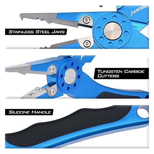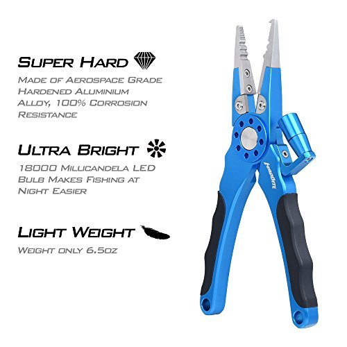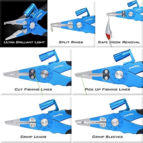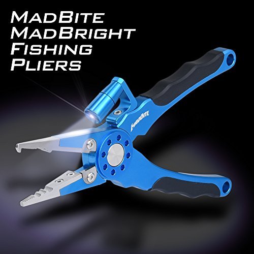 - DURABLE Aluminum fishing pliers with powerful light for hook pulling or braided line cutting at night. 7.5” size offers more grip and leverage for faster, cleaner cutting and more force for easy crimping. MadBite hard anodized aluminum fish pliers and fishing line cutters outlasts other brands, stay bright, and do not fade. Features split ring tool and stainless steel saltwater corrosion resistant components.