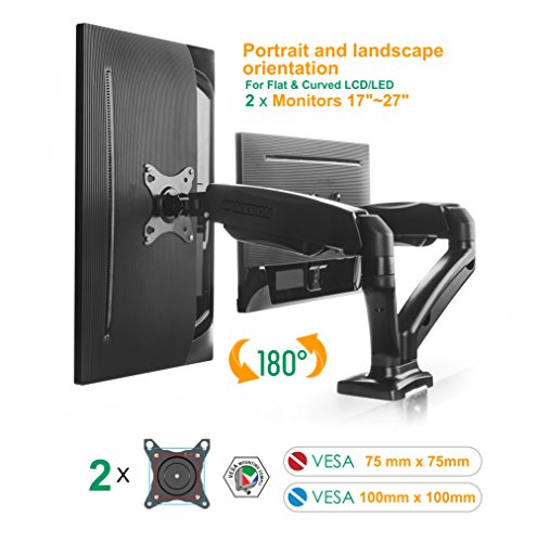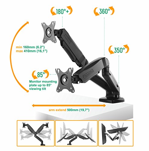 -. Binding : Electronics -. Brand : ONKRON -. Color : Alloy black -. EAN : 4603726156837 -. Feature : TWO MONITORS AT ONCE: Dual monitor desk mount stand G160 will give you a higher level of productivity. It will help to provide a new range of adaptable positions for your displays. / COMPATIBILITY: Monitor mount perfectly fits two screens from 13'' to 27 inch up to 14.3 lbs each with VESA hole pattern 75 x 75 mm or 100 x 100 mm. / FULLY ARTICULATING MONITOR MOUNT: This model provides 360 degrees rotation, tilt angle +90° to -45° and swivel from +90° to -90°; the arm extends up to 17.7". / DESK CLAMP OR GROMMET: Choose one of two available ways of installation - C-Clamp or Grommet mount; desk thickness must be between 0.39" - 3.3''. / INTEGRATED CABLE MANAGEMENT system of this monitor mount keeps your power and AV cables clean and organized all the time. -. Label : Standmounts -. Manufacturer : Standmounts -. Model : G160 -. MPN : G160 -. PackageQuantity : 1 -. PartNumber : G160 -. ProductGroup : Personal Computer -. ProductTypeName : COMPUTER_ADD_ON -. Publisher : Standmounts -. Size : 2 screens 13'' - 27" -. Studio : Standmounts -. Title : ONKRON Dual Monitor Stand Gas SP.R.Ing Desk Mount for 13'' - 27 Inch LED LCD Flat Panel TVs up to 14.3 lbs Full Motion Mounting Arm - G160