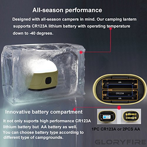 1. All-season performance: Designed with all-season campers in mind. Our camping lantern supports CR123A lithium battery with operating temperature down to -40 degrees.