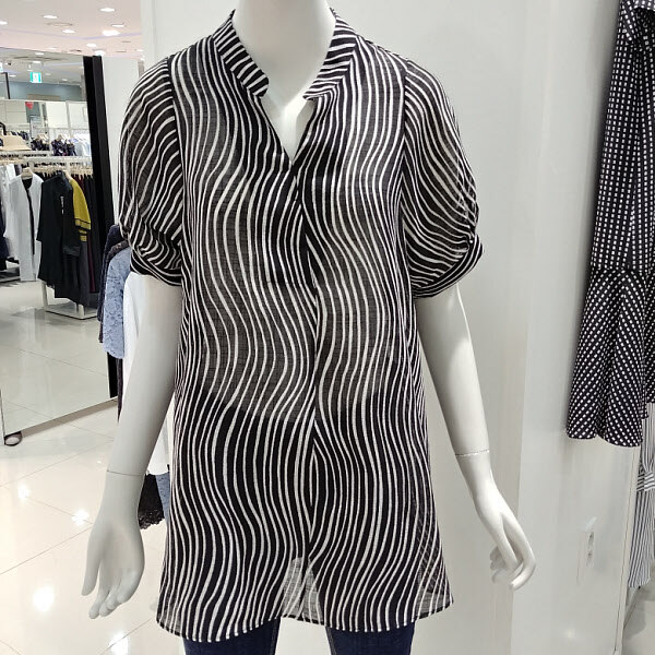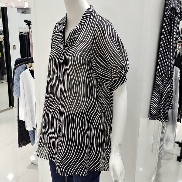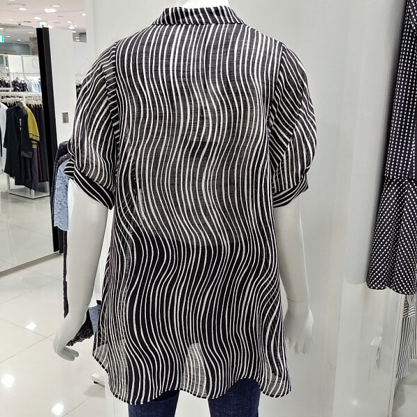프린트가 들어가 세련되고 여성스러움이 돋보이는블라우스 입니다 얇고 몸에 붙지않아서 여름동안시원하게 입기 좋고 포인트로 소매에 턱을 잡아볼륨감을 살려 고급스러워 보입니다 밑단이 살짝 퍼지면서 힙을 덮는 기장으로 편안하게착용하기 좋습니다 29인치 기장입니다