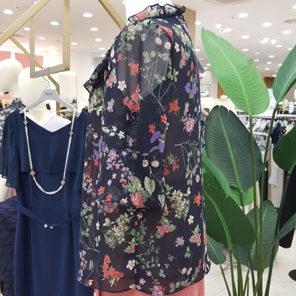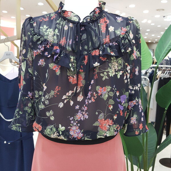목선 프릴과 리본끈이 사랑스러운 블라우스입니다. 플라워패턴이 들어간 프린팅이 화사하고 여성스러운 블라우스입니다.