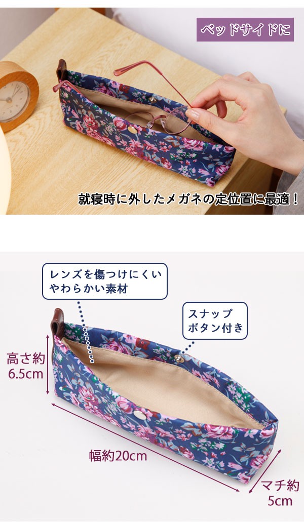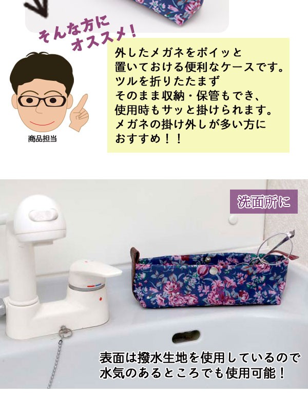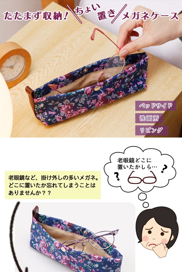 | 掛けたり外したりすることが多い老眼鏡などを、ポイッと置いておける便利なめがねケースです。ツルを折りたたまずそのまま収納・保管もでき、使用時もサッと掛けられます。ベッドサイドに置いて就寝時に外したメガネの定位置に最適!表面は撥水生地を使用しているので、水気のある洗面所などでも使用可能です。内側はやわらかい素材でレンズを傷つけにくくて安心。メガネの掛け外しの多い方におすすめ! |