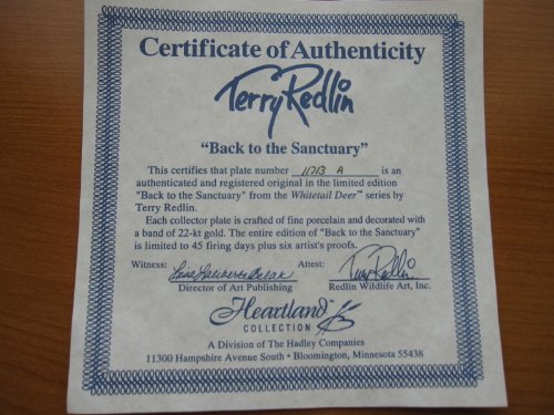 Studio : The Hadley Plate Collection Publisher : The Hadley Plate Collection Binding : Kitchen Product Description This "collector plate is crafted of fine porcelain and decorated with a band of 22-K gold. The entire edition of 'Back to the Sanctuary' is limited to 45 firing days plus six artist's proofs." 0