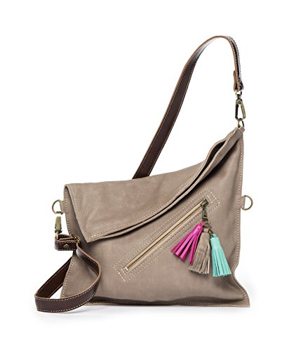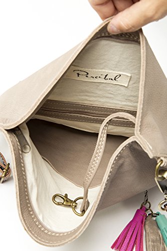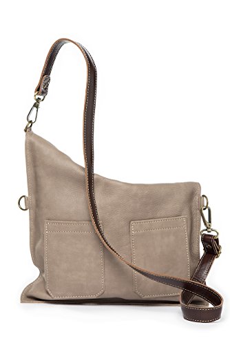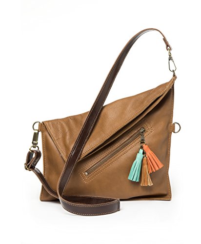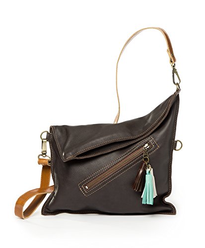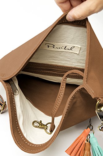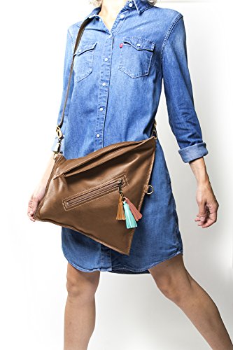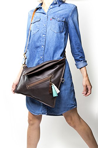 This leather crossbody bag it can be used in several ways: Completely folded. In its full capacity fashion (unfolded). Should you need more room to carry stuff?, you can change the strap and hook it to the upper rings to gain capacity. COLORS MATERIALS Hand-made in 100% genuine cow leather. This kind of leather is very soft and supple. It has three leather tassels. The strap is adjustable, with opaque bronze finishings. The color of the strap is chocolate, it combined perfectly with the color of the bag and is made with a thicker leather in order to have more resistance to all day activities. 3 colors available: Tan (light brown style), Grey (taupe style) and Dark Brown (chocolate style). INSIDE OUTSIDE