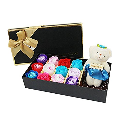 WINOMO Pack of 12 Scented Bath Soap Rose Flower Petals in Box with Bear for Birthday Wedding Valentine (Multicolor)