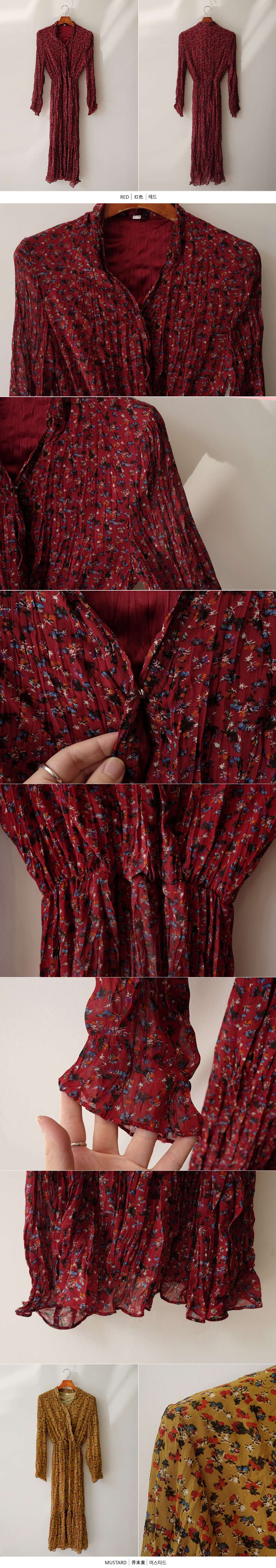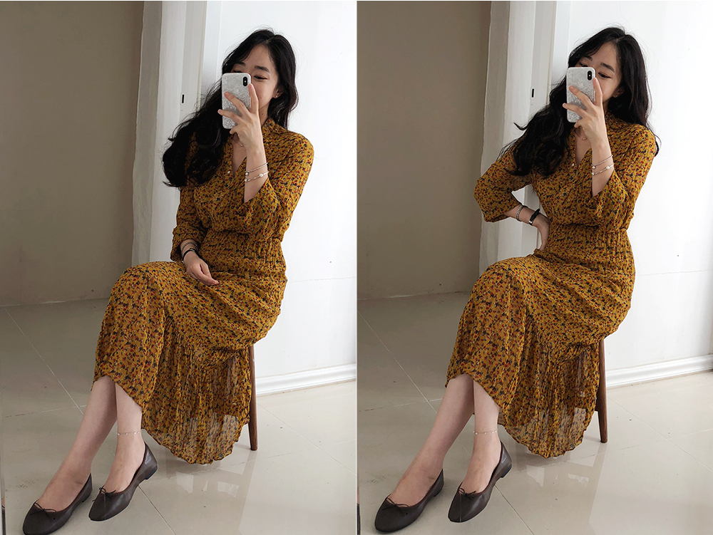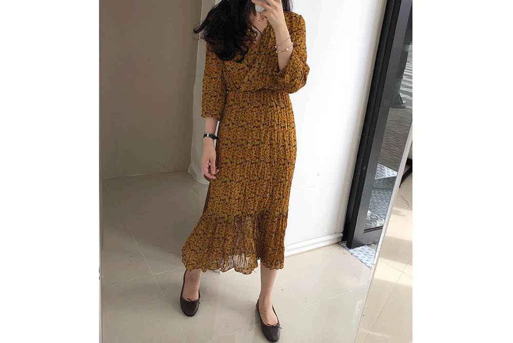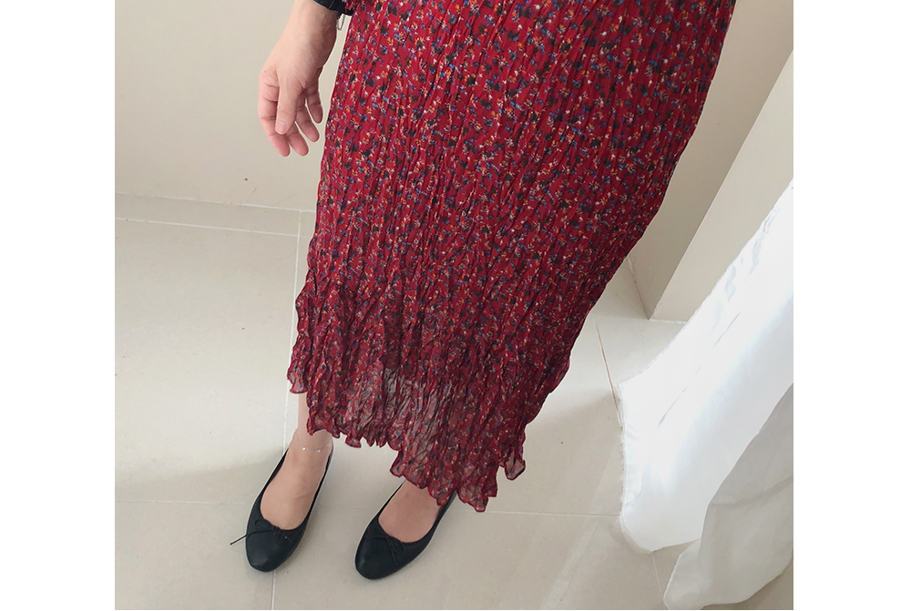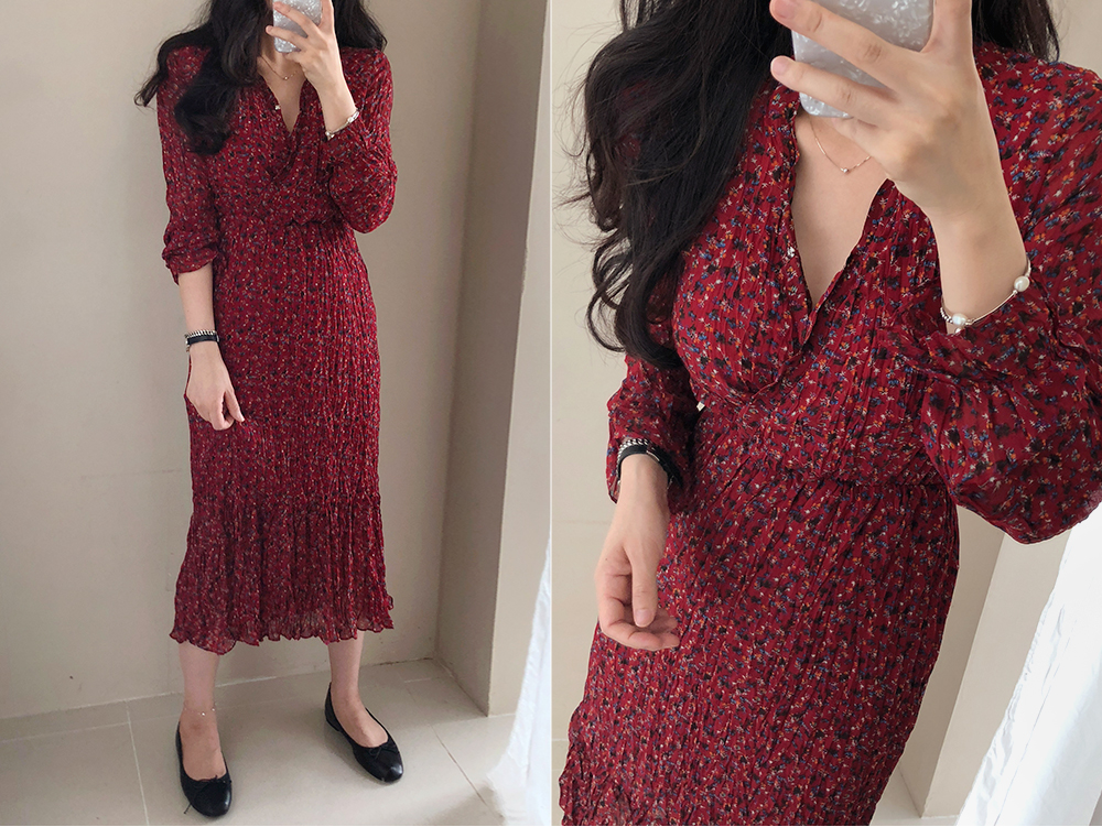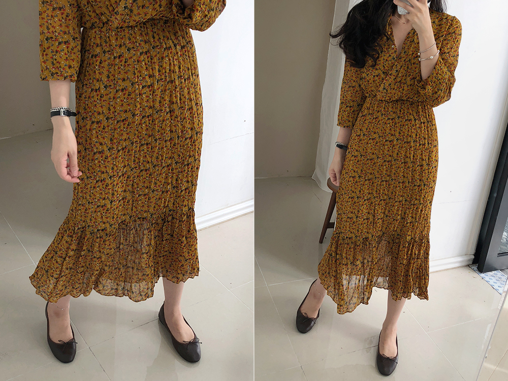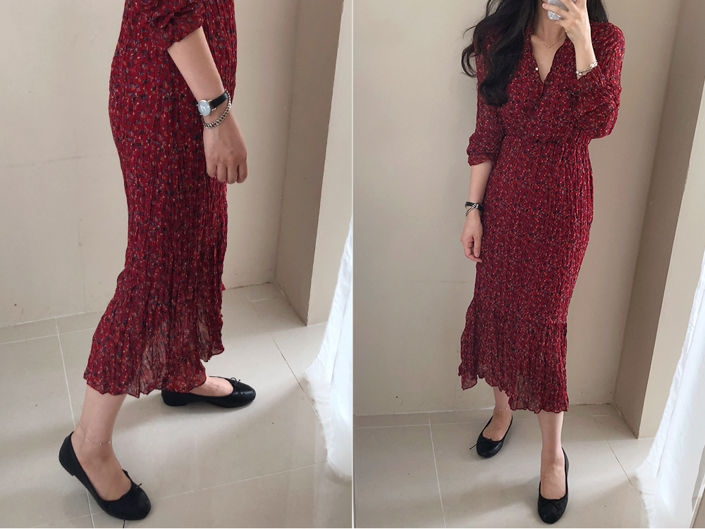 잔꽃 주름 밴딩 롱 원피스