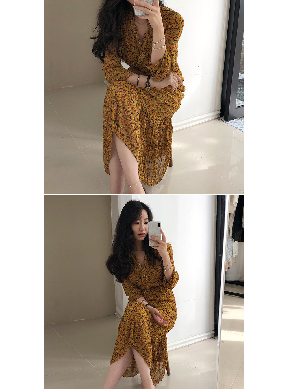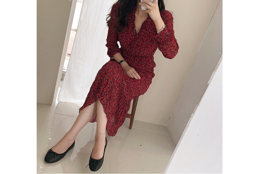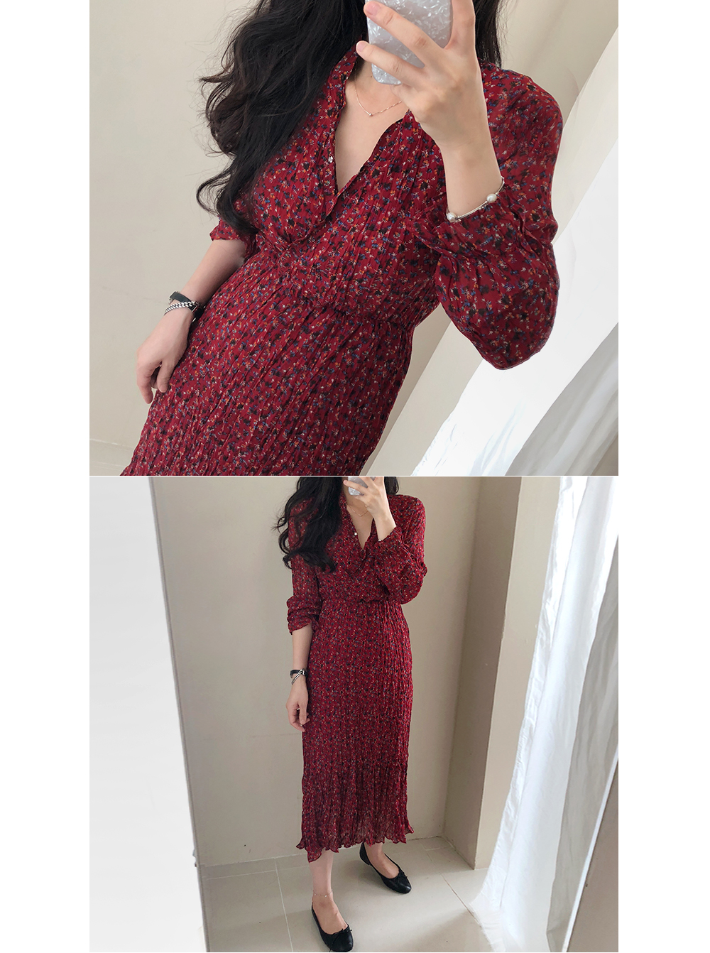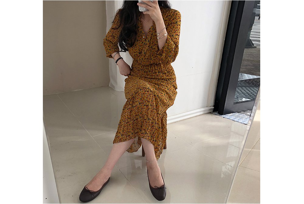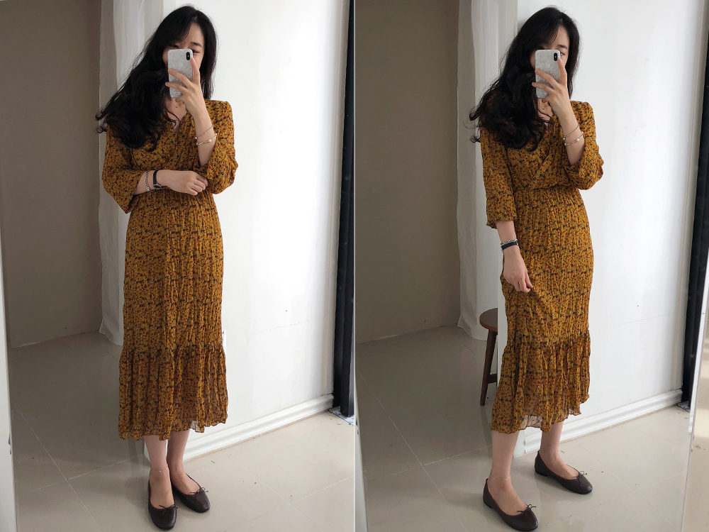 잔꽃 주름 밴딩 롱 원피스