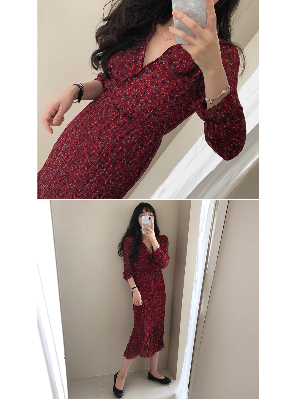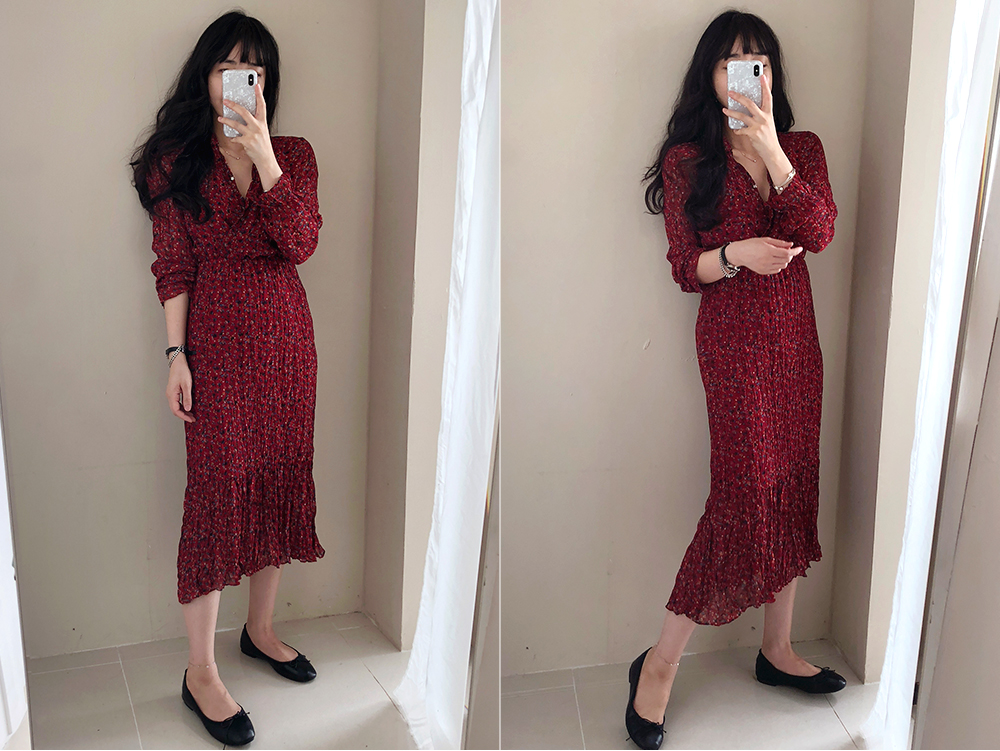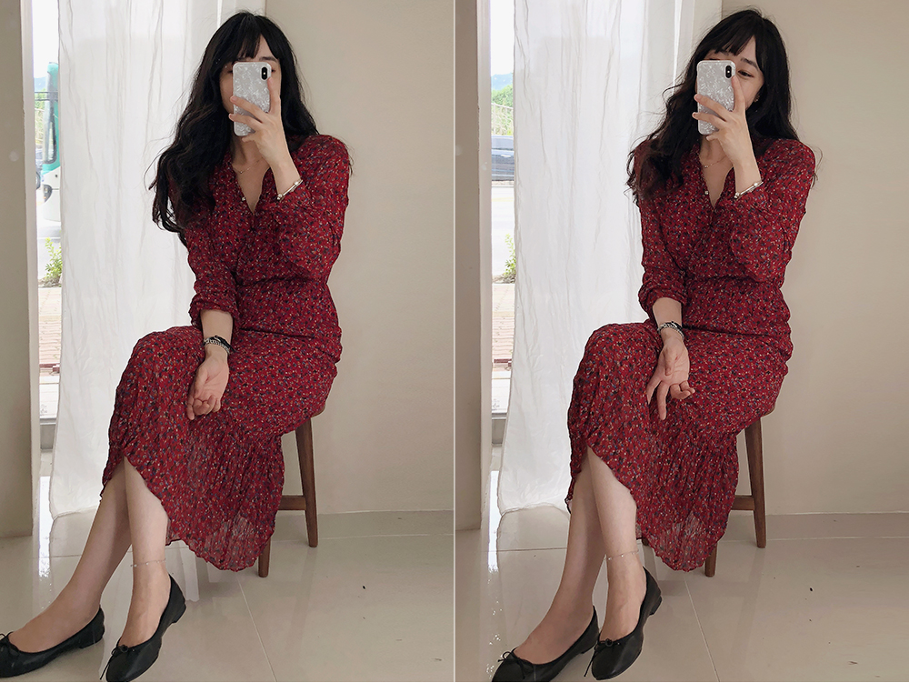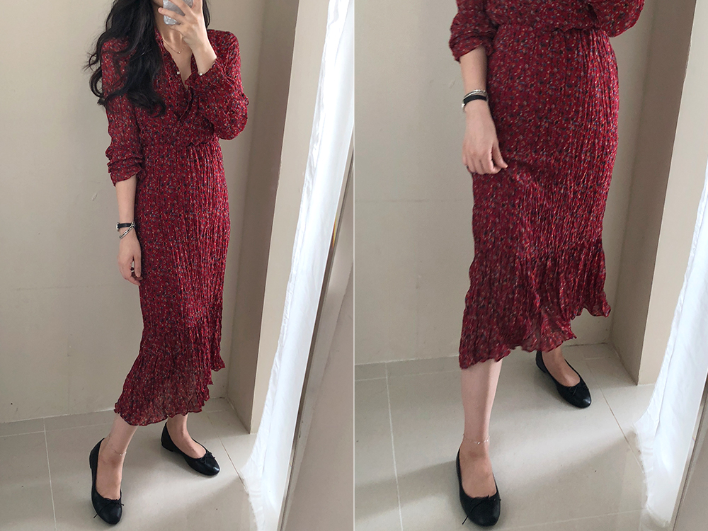 러블리한 매력이 듬뿍 담긴 플라워 롱 주름 원피스 소개해드려요.