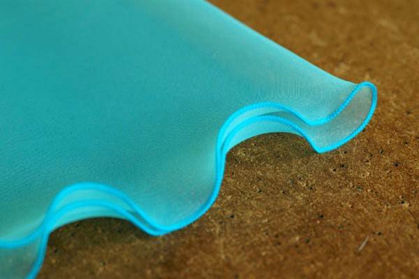 さまざまなバリエーションをお楽しみいただけるリーフデザインです。(えんぴつのように両端がとがっています) シンプルなオーガンジーショールですが、贅沢にバイアスで裁断し、ふちが波打つようにデザインしています。