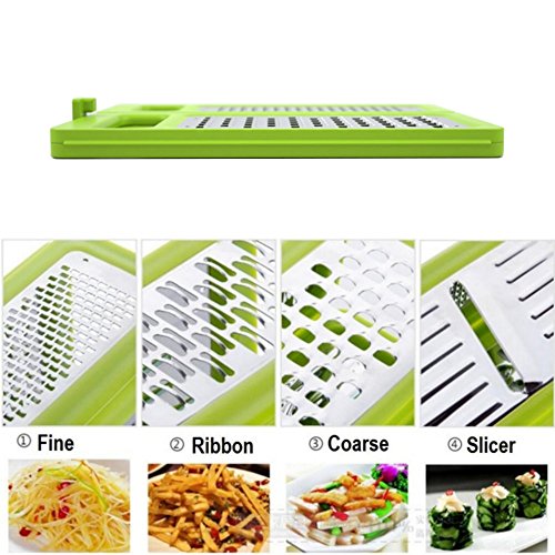 Four blades styles in one: Coarse for cheese or vegetables; Fine for nutmeg, parmesan, citrus zest, garlic; Ribbon for soft cheese or chocolate;Slicer for cucumber, potatoes etcs