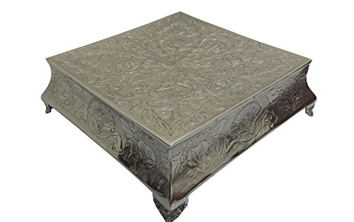 -. Feature : Introducing a new design for 2015 with unique tapered sides and full embossed design on all the surfaces / We are among the largest manufacturer in the world of cake stand line and every piece is handcrafted / Top surface is 18"x 18" square and height is about 6.75" and sides are tapered / Your satisfaction is 100% guaranted / Silver finish with nickel plated and very strongly built for multilayer cake as opposed to cheaply built cake stands available in market