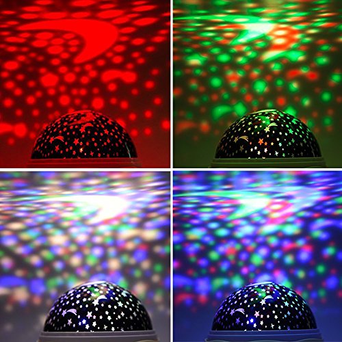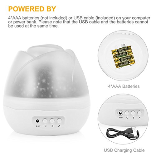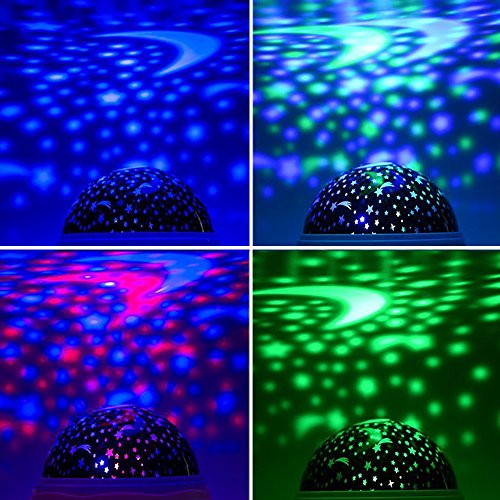 -. Feature : ✬ Newest Version with 2 Cover ,4 LED Bead / 3 Modes, Projects sky moon and star light, shape into romantic cosmos starry sky, perfect for Wedding Decorations, Baby's Room etc. / ✬ More Then One:Night Light Decorative, There are popular Star Sky Moon Cover +Cosmos Cover Projector lamp, they can help you put the universe back home, give you a piece of the sky changes color, without need for hard to find the field. / ✬ 360 Degree Rotating Night Light Kids Rotating its base, there will be different colorful space, to find your constellation. The Higher power Beads are more Bright and more beautiful Lighting Range is also bigger than an old one. / ✬ More Bright:Night Light Kids with 3 buttons located on the front which labeled A, B and C. A - yellow light mode button ,can turn the yellow light on and off, B - cycles through color options,and C - turns on and off the rotating motion option. Power by 4 x AAA battery (Not Included) or USB cable. / ✬ Kids Will Love This:Your child will be mesmerized by the rotation of the galaxy while feeling comfort in the projecting lights. Luminous and colorful LED lights will create a calm ambiance in the kid's room, giving your kid a good imagination.