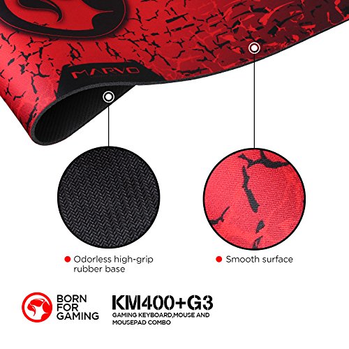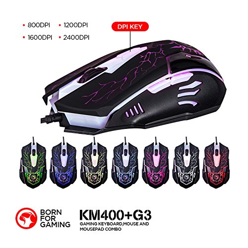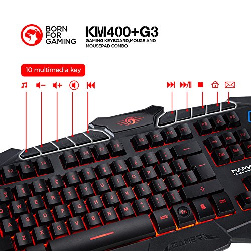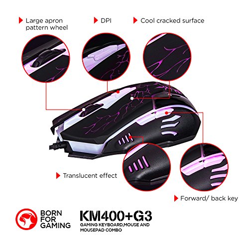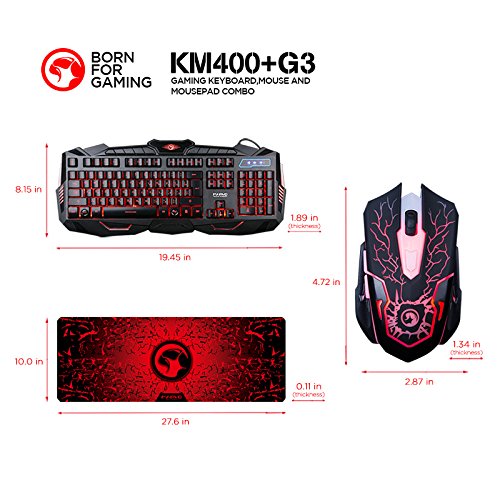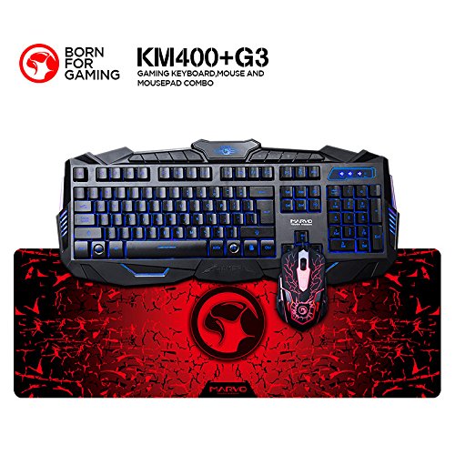 MARVO BORN FOR GAMING KM400+G3,pro gaming keyboard, mouse and mouse pad combo for enter level players 113 keys USB wired backlit keyboard with 10 multimedia keys, anti ghosting 19 keys roll over support, big keys and wide edge palm rest ,3 colors adjustable backlighting keyboards with see through characters, 5 drain hole at the bottom of the keyboards Symmetrical 6D gaming mouse, both left and right hand can use it, 7 colors LED lighting mouse, DPI 800/1200/1600/2400, large apron pattern wheel, cool cracked surface mice bring impressive visual impact Large mouse mat ,cool scorpion tail logo, environmental protection cloth, smooth surface without been fold ,extended odorless high grip rubber base mouse pad Product Specification Keyboard - 113 keys with 10 multimedia keys, anti-ghosting 19 keys roll over support