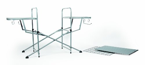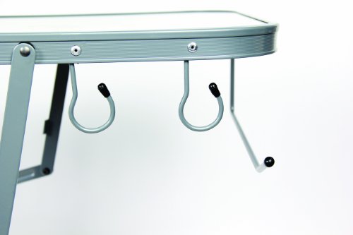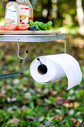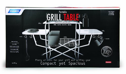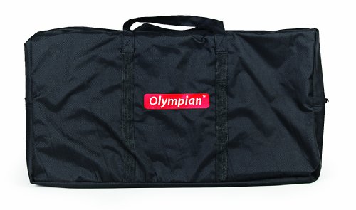 Heat-resistant aluminum top surface accommodates your portable grill and sturdy side tables fold out to hold condiments and utensils. Features: Bottom rack for accessories A handy paper towel rack and built-in hooks for your grilling utensils. High strength steel frame is designed for durability, with easy set-up and take-down Includes handy carry bag. Olympian Deluxe Grilling TableFeature