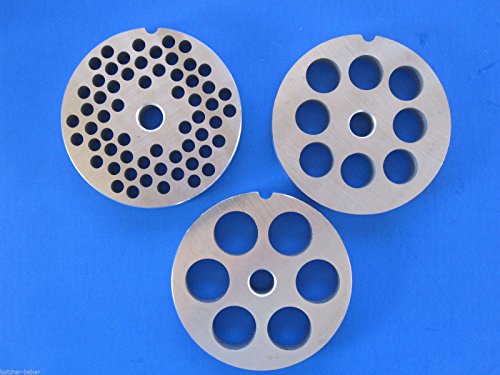 Studio : Smokehouse Chef Publisher : Smokehouse Chef Product Description 4 pc assorted set of size #22 meat grinder plates and knife. These plates are industry standard size of 3 3/16" diameter so PLEASE MEASURE your old one prior to ordering to confirm that you have the size #22 grinder. Plate hole sizes are 1/4" (burger), 1/2" (sausage) and 3/4" (coarse and chili). Plus a new stainless stainless sharp cutting blade. These parts fit LEM, Cabelas, Hobart, Biro and virtually all other brands. Stainless steel means NO Rust or maintenance. Dishwasher safe parts. 0