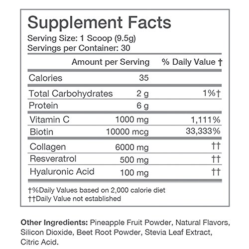 -. Feature : 5 POTENT INGREDIENTS: Collagen + Resveratrol + Biotin + Vitamin C + Hyaluronic Acid are the five most powerful, scientifically proven ingredients for optimal skin care and overall wellness. Uses substantial, highly effective doses that show quick, positive benefits in real clinical studies. / RESTORE YOUTHFUL SKIN: Actively repairs aging, damaged skin. Reduces the appearance of wrinkles, blemishes and cellulite by increasing skin's moisture, firmness and regeneration. Improves skin elasticity and for a flawless, radiant complexion. / PROMOTES HEALTHY HAIR AND NAILS: Nourishes hair and nails. Supports vigorous hair growth, making it thick, shiny and smooth while reducing split ends, breakage and brittleness. Stimulates production of clear, strong nails. / REPAIRS JOINTS, TENDONS AND CARTILAGE: Strengthens bones, joints and connective tissue to improve stability, movement, and flexibility. Builds tendons, ligaments and cartilage while lubricating joints to reduce inflammation, stiffness, and pain. / SUPERIOR QUALITY: Contains only purest, highest quality, natural ingredients. Our marine collagen is odorless, colorless and tasteless, and is superior to collagen sourced from beef, pork and chicken due to its superb digestibility and bioavailability. Clean, fresh, delicious fruit flavor. Dissolves easily in cold liquids.