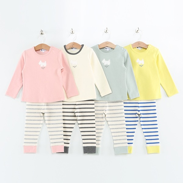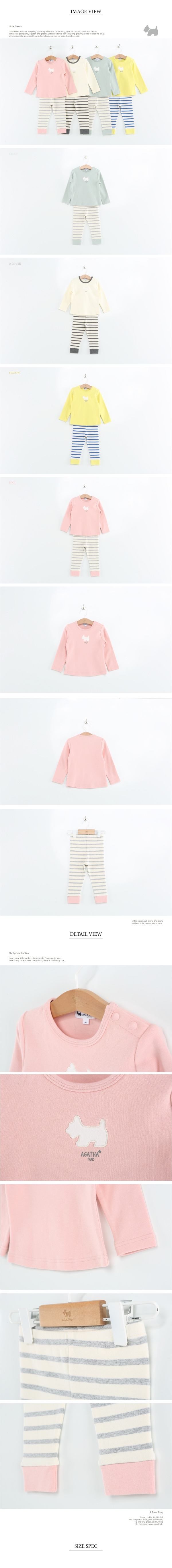 스판성 좋은 티셔츠와 스트라이프 레깅스로 구성된 세트 상품입니다.귀여운 아가타 아플리케 자수로 포인트를 주었습니다.
