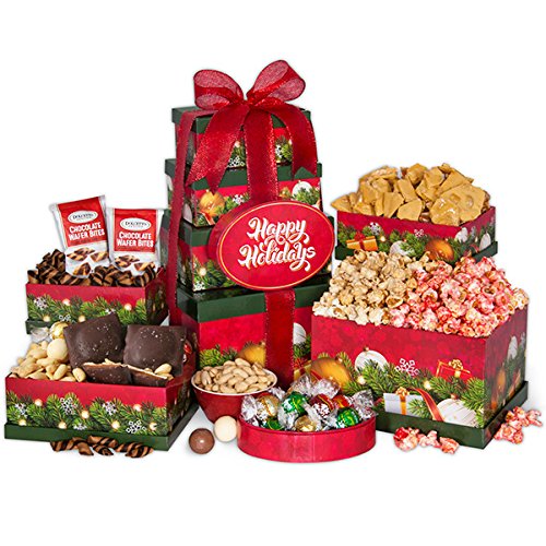 -. Feature : Brightening up their holiday couldn't be easier than with this festive Happy Holidays Gift Tower, exclusively from GourmetGiftBaskets.com! / Inside four holiday boxes are Lindor white chocolate, milk chocolate, and mint chocolate truffles, cashew brittle, chocolate wafer bites, gourmet roasted peanuts, a dark chocolate caramel graham cracker, and two of our exclusive KingofPOP holiday popcorns: Gingerbread Spice and Candy Cane Kettle Corn! / Keepsake holiday tower boxes are wrapped with a festive ribbon / 100% Satisfaction Guarantee for you and your recipient only from seller GourmetGiftBaskets.com!